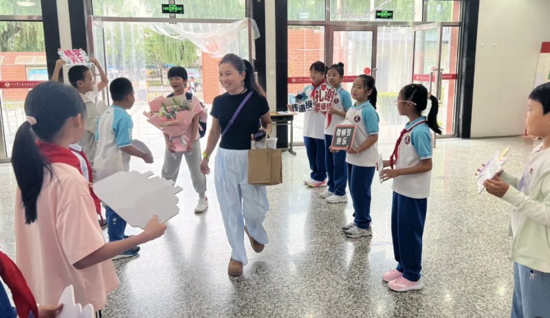 他们笑容灿烂,恭敬鞠躬,热情问好,将饱含心意的鲜花、亲手绘制的贺卡递到老师手中。这一场校门口的“暖心迎接”,不仅开启了教师们满含温情的节日,更以质朴行动传承着尊师重教传统,践行着主题中对教师敬重的深刻内涵。