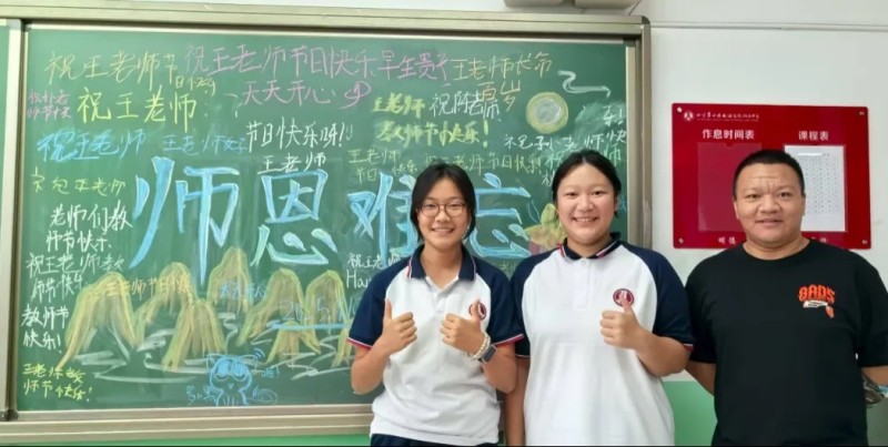 学生们主动分工协作,用彩色粉笔在黑板上绘出教师节主题板报,图案灵动、文字暖心。同学们将亲手制作的剪纸、折纸花、黏土摆件等手工艺品,有序摆放在讲台与教室角落,还在墙面贴满写满祝福的便利贴。当教师们踏入焕然一新、满是心意的教室,欣慰笑容不禁绽放在脸庞。这满室的惊喜成为学生们向教师致敬的生动注脚。