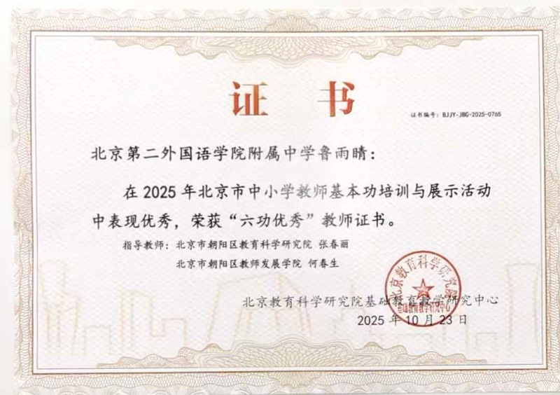 喜报 | 祝贺二外附中(北京中学外语分校)教师鲁雨晴老师荣获2025年北京市中小学教师基本功培训与展示活动“六功优秀”荣誉称号