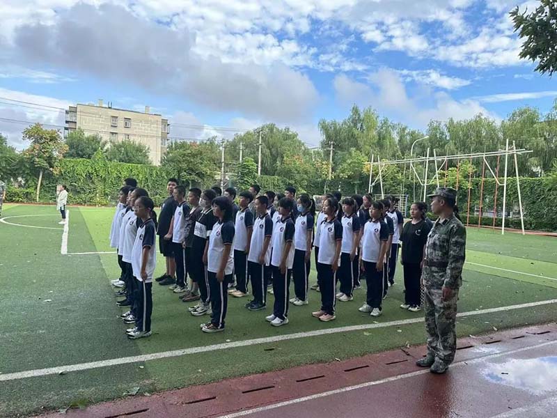 6班姚朋同学即使手臂受伤,绑着绷带仍然坚持训练。同学们在训练中增强了组织纪律性和集体观念,锻炼了艰苦奋斗、勇敢顽强的意志品格。