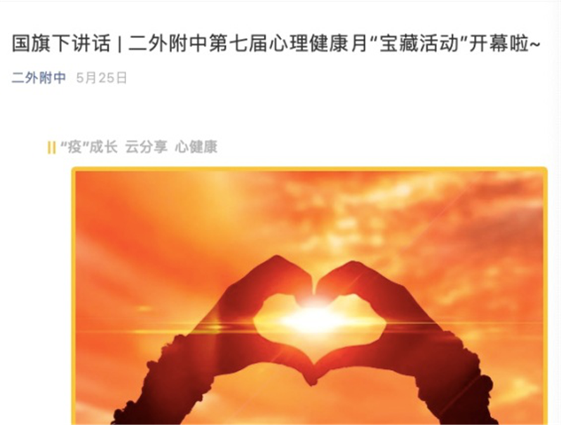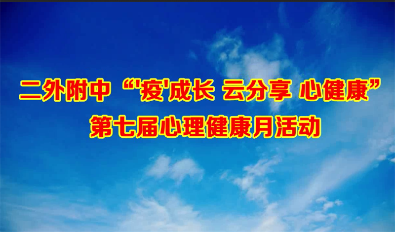 为实现疫情防控常态化条件下的心理健康教育工作持续高效开展,提升学生心理健康水平,二外附中在5月至6月举办了“‘疫’成长 云分享 心健康”心理健康月活动,全体同学积极参与了各类心理健康活动,达到了预期的效果。