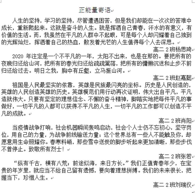 2020年是不平凡的一年,严峻的疫情时刻牵引着人们的思绪,心理健康教育中心一直关注同学们的心理健康,呼吁同学们关注心灵,培养积极乐观的心理品质,引导同学们正确面对各种困惑,并学会挑战面临的困难,主动探寻适合自己的解决途径。高二年级部分优秀正能量寄语展示: