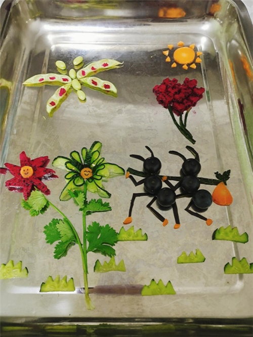 太阳(胡萝卜)代表光明和无限的希望;花朵(黄瓜、火龙果、香菜)既是美好的象征也代表阳光下茁壮成长的我们,所以还配有笑脸(胡萝卜)做装饰,给花朵增添了生动性;两只小蚂蚁(蓝莓)在搬东西,一方面为整个作品带来了趣味性,另一方面也象征着我们在美好的生活里努力学习,努力奋斗;蝴蝶(毛豆)是自由的象征,寓意着美好浪漫的生活,心形热气球(火龙果)代表生活中的希望和爱。