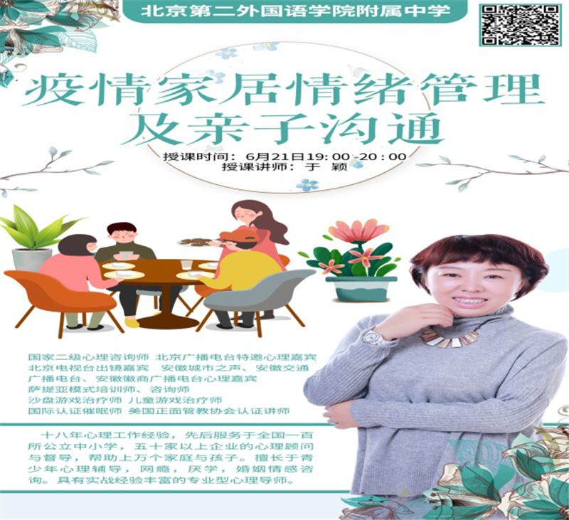 二外附中一直关注学生的心理健康,在区教委、朝阳分院和学校领导的支持下持续、高效开展心理健康教育工作,提升学生心理健康水平,营造健康、和谐的心理文化氛围,融洽亲子关系,规划未来,启迪心灵,立足云平台,助力心发展。