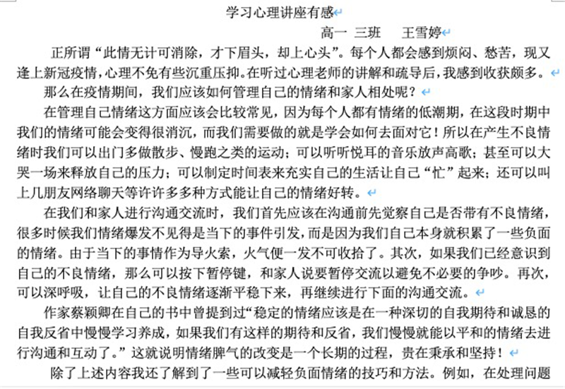疫情期间,年级主任发挥力量,组织班主任和科任教师通过电话、微信、腾讯会议等多种形式和学生进行谈心谈话,稳定学生心态和情绪,激励学生认真准备期末考试,引导学生以积极心态面对突发的疫情,学会自我情绪调节与管理。同时保持与家长沟通,及时了解学生情况,帮助家长和学生建立良好的亲子关系。